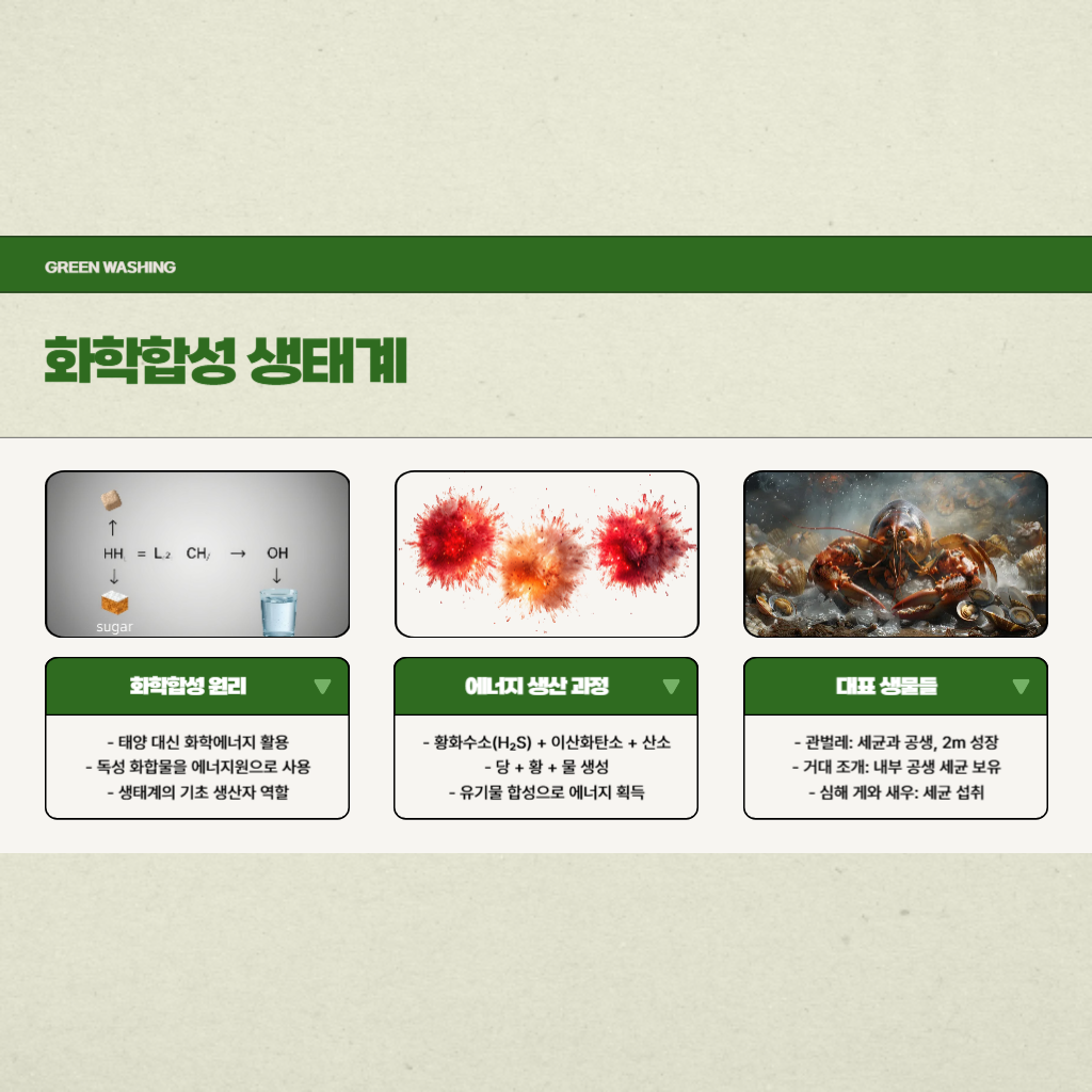 심해열수구 생물들의 에너지 원천은 태양이 아니라 화학에너지입니다. 이곳 생물들은 황화수소(H₂S), 메탄(CH₄)과 같은 독성 화합물을 에너지원으로 활용하는 화학합성 세균을 기반으로 생태계를 이루고 있습니다.