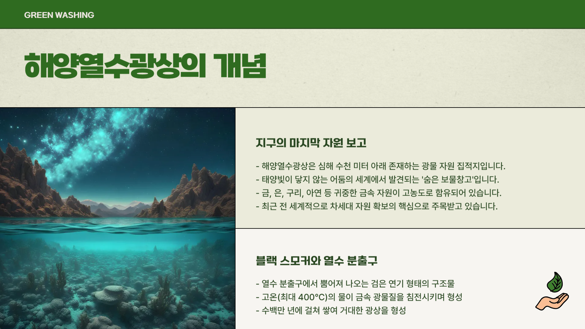 “지구의 마지막 자원 보고는 어디에 있을까?” 많은 과학자들은 그 해답을 심해, 그것도 수천 미터 깊이의 해저에서 찾고 있습니다. 눈부신 햇빛도, 녹음 짙은 숲도 존재하지 않는 어둠의 세계. 그런데 그곳에서 뜨겁게 솟구치는 검은 연기와 함께 금, 은, 구리, 아연 같은 귀한 자원이 모습을 드러냅니다. 바로 ‘해양열수광상(hydrothermal vent deposit)’이라는, 지금까지 우리가 거의 손대지 못한 지구의 숨은 보물창고입니다.